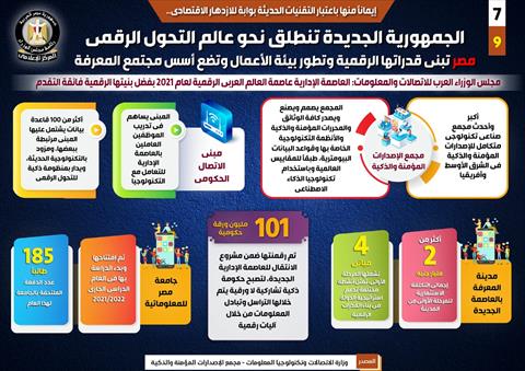 نشر المركز الإعلامي لمجلس الوزراء، تقريراً شمل إنفوجرافات تسلط الضوء على انطلاق الجمهورية الجديدة نحو عالم التحول الرقمي في ظل بناء مصر لقدراتها الرقمية وتطور بيئة الأعمال ووضع أسس مجتمع المعرفة، إيمانا منها باعتبار التقنيات الحديثة بوابة للازدهار الاقتصادي.