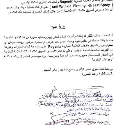 وقال عبدالحميد، أنه إزاء ذلك تقدمنا بإنذار بفسخ التعاقد مع شركة تراست ديچيتال، ثم إنذار للسادة الشركة المصرية لمدينة الإنتاج الإعلامي، وإنذار آخر لمجموعة قنوات بانوراما، وكذلك إنذار للسيد رئيس المجلس الأعلى لتنظيم الإعلام فحواها التحذير من تلك المنتجات مجهولة المصدر التي يتم الترويج لها من قبل شركة تراست عبر الفضائيات والمنسوبة للعلامة التجارية Regenix، لذا وجب التنويه والتحذير من التعامل مع الشركات المعلنة لتلك المنتجات مجهولة المصدر بإسم Regenix على شاشة الفضائيات حرصاً على سلامة السادة العملاء والذوق العام، وحفاظا على الحقوق المادية والأدبية للشركتين الموكلتين .