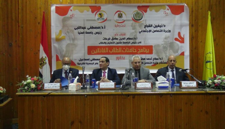 في حفل نظمته الإدارة العامة لرعاية الطلاب، إدارة النشاط الاجتماعي، بالتعاون مع وحدة التضامن الاجتماعي بالجامعة التابعة لوزارة التضامن الاجتماعي، برعاية من الدكتورة نيفين القباج وزيرة التضامن الاجتماعي، والدكتور مصطفى عبد النبي عبد الرحمن رئيس جامعة المنيا، وإشراف عام وحضور الدكتور عصام فرحات نائب رئيس الجامعة لشئون التعليم والطلاب؛ والدكتور صلاح أحمد هاشم مستشار وزيرة التضامن الاجتماعي، تم تكريم عدد 25 طالباً وطالبة من الطلاب الفائقين بكليات الطب والصيدلة والهندسة والعلوم والزراعة، وطلاب الدراسات العليا، من قبل وزارة التضامن الاجتماعي، وذلك ضمن فعاليات برنامج “حاضنات الطلاب الفائقين”، الذي أطلقته وزارة التضامن الاجتماعي.