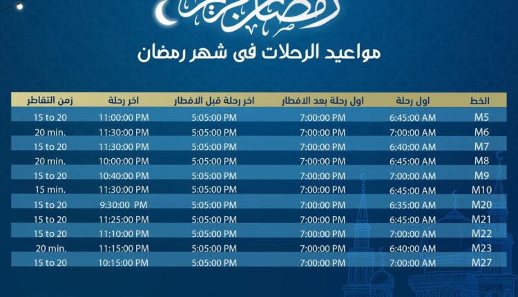 وأوضحت الشركة في بيان لها عن مواعيد آخر رحلة طول أيام شهر رمضان وهي في خط M5 في تمام 11 مساء، M6 وM7وM10 في تمام الساعة 11:30 مساء ، على أن تكون آخر رحلة لخط M8 في تمام العاشرة مساء، وM9 في تمام 10:40 مساء ، خط M20 في تمام 9:30 مساء ، وخط M21 في تمام11:25 مساء ، M22 في تمام 11:10 مساء ، M23 الساعة 11:15 مساء ، وبالنسبة لخط M27 تقلع فيه آخر رحلة في تمام 10:15 دقيقة.