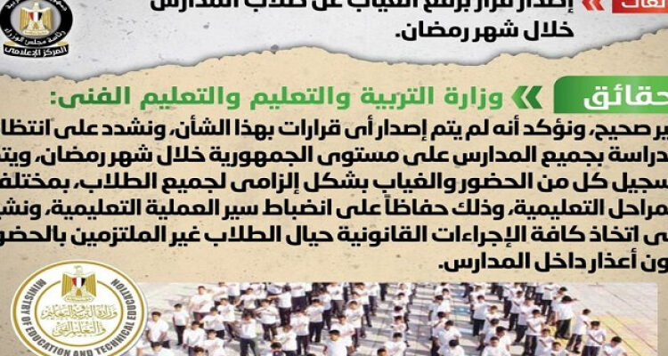 وقال المركز، في بيان اليوم، إنه قام بالتواصل مع وزارة التربية والتعليم والتعليم الفني، والتي نفت تلك الأنباء، مُؤكدةً أنه لا صحة لرفع الغياب عن طلاب المدارس خلال شهر رمضان، وأنه لم يتم إصدار أي قرارات بهذا الشأن، مُشددةً على انتظام الدراسة بجميع المدارس على مستوى الجمهورية خلال شهر رمضان، ويتم تسجيل كل من الحضور والغياب بشكل إلزامي لجميع الطلاب، بمختلف المراحل التعليمية، وذلك حفاظاً على انضباط سير العملية التعليمية، مُشيرةً إلى اتخاذ كافة الإجراءات القانونية حيال الطلاب غير الملتزمين بالحضور دون أعذار داخل المدارس.