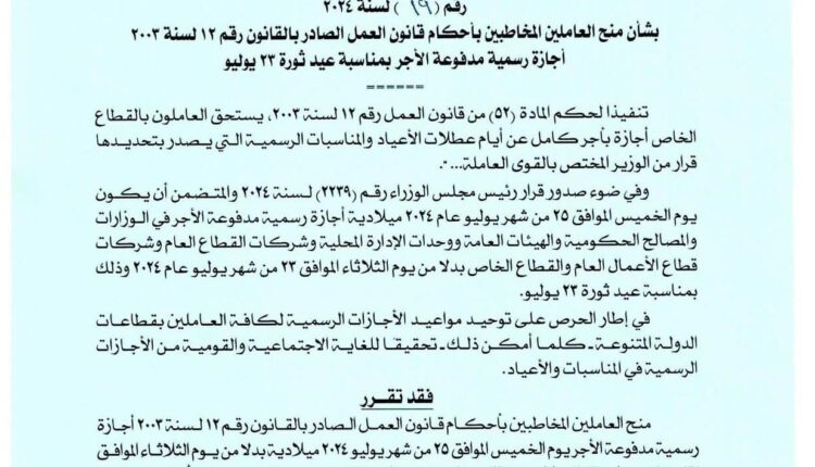 وأشار الكتاب الدوري إلى منح العاملين المخاطبين بأحكام قانون العمل الصادر بالقانون رقم 12 لسنة 2003،إجازة رسمية مدفوعة الأجر ،وذلك يوم الخميس الموافق 25 من شهر يوليو 2024 ،بدلا من يوم الثلاثاء الموافق 23 يوليو ، مع التنبيه على أحقية صاحب العمل تشغيل العامل في هذا اليوم إذا اقتضت ظروف العمل ذلك ،ويستحق العامل ،في هذه الحالة بالإضافة أجره ،عن هذا اليوم مثلي هذا الأجر ..ويأتي ذلك في إطار الحرص على توحيد مواعيد الإجازات الرسمية لكافة العاملين بقطاعات الدولة المتنوعة -كلما أمكن ذلك – تحقيقا للغاية الإجتماعية ،والقومية ،من الإجازات الرسمية في المناسبات والأعياد،وذلك في إطار قرار رئيس مجلس الوزراء رقم 2239 لسنة 2024،والمتضمن ،أن يكون يوم الخميس الموافق 25 يوليو عام 2024 ميلادية إجازة رسمية مدفوعة الأجر للعاملين في الوزارات والمصالح الحكومية ،والهيئات العامة ،ووحدات الإدارات المحلية ،وشركات القطاع العام ،وشركات قطاع الأعمال العام ،وشركات القطاع الخاص ،وذلك بدلا من يوم الثلاثاء الموافق 23 يوليو 2024.