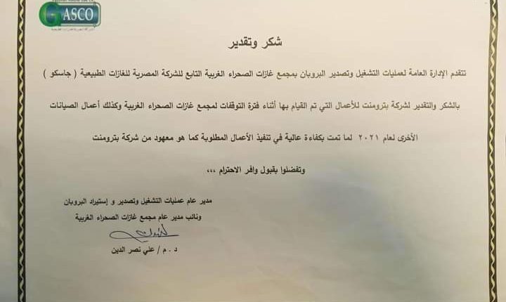 قامت شركة “جاسكو” بإرسال خطاب شكر وتقدير إلى شركة “بترومنت” بشأن الأعمال التي قامت بها الشركة أثناء فترة التوقفات لمجمع غازات الصحراء الغربية وكذلك أعمال الصيانات الأخري لعام ٢٠٢١ ، حيث تم تنفيذ الأعمال المطلوبة بكفاءة عالية.