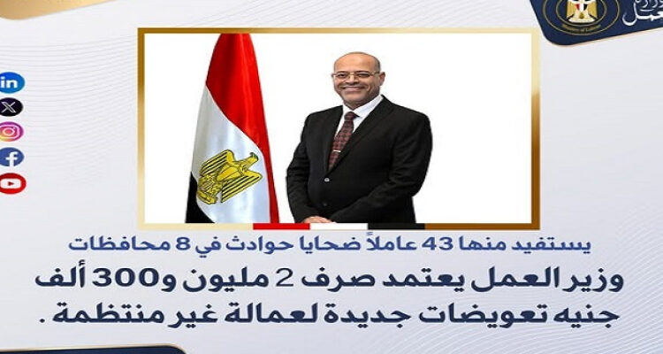 اعتمد محمد جبران وزير العمل مبلغ 2 مليون و300 ألف جنيه تعويضات جديدة، يستفيد منها 43 عاملًا من 8 محافظات، لقوا حتفهم أو