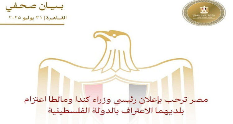 رحبت مصر، في بيان صادر عن وزارة الخارجية اليوم الخميس، العربية، بإعلان رئيس الوزراء الكندي “مارك كارني” ونظيره المالطي “روبرت أبيلا” اعتزام بلديهما الاعتراف بالدولة الفلسطينية.