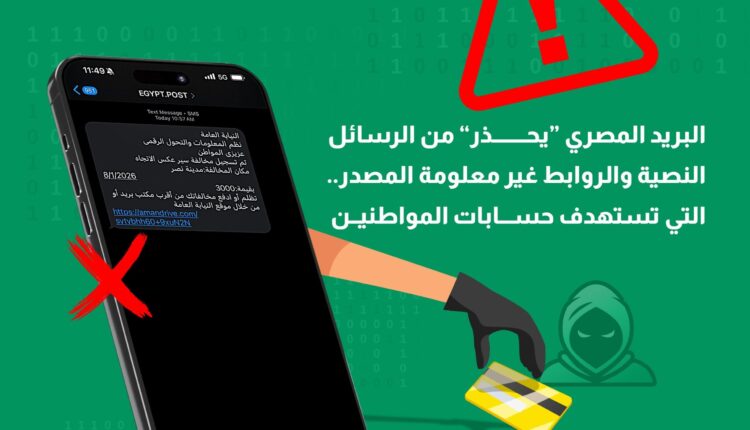 يحذر البريد المصري المواطنين من محاولات احتيال إلكترونية جديدة، تتم من خلال إرسال رسائل نصية (SMS) إلى المواطنين تدّعي تسجيل مخالفات مرورية وفرض غرامات مالية عليهم وتحتوي أيضا على روابط إلكترونية مزيفة تستهدف اختراق حسابات المواطنين؛ حيث يتم من خلالها طلب بيانات أو حسابات المواطنين الشخصية، بزعم سداد غرامات مخالفات مرورية، مع الإدعاء أنها صادرة من البريد المصري.