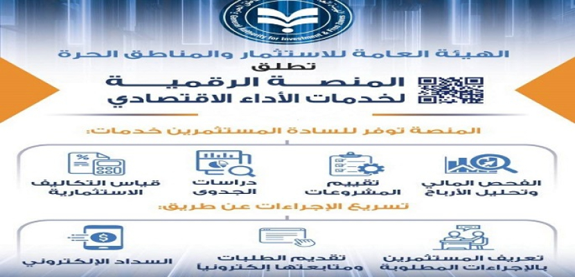 تعلن الهيئة العامة للاستثمار والمناطق الحرة عن إطلاق المنصة الرقمية لخدمات قطاع الأداء الاقتصادي، وذلك كمنصة موحدة لتقديم الخدمات الفنية المتخصصة للمستثمرين يأتى ذلك في إطار توجه الدولة نحو التحول الرقمي وتطوير البنية المعلوماتية للخدمات الاستثمارية.
