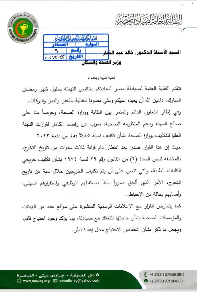 وأرسلت النقابة العامة لصيادلة مصر، اليوم الاثنين 23 فبراير، خطابًا رسميًا إلى وزير الصحة أعربت فيه عن رفضها قرارات اللجنة العليا للتكليف بوزارة الصحة، التي تضمنت تكليف نحو 45% فقط من صيادلة دفعة 2023.