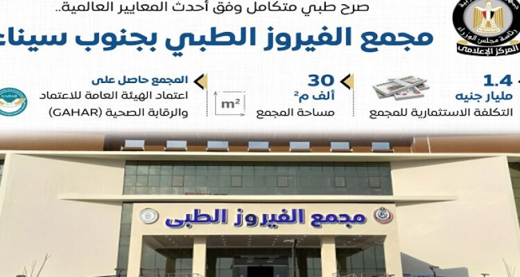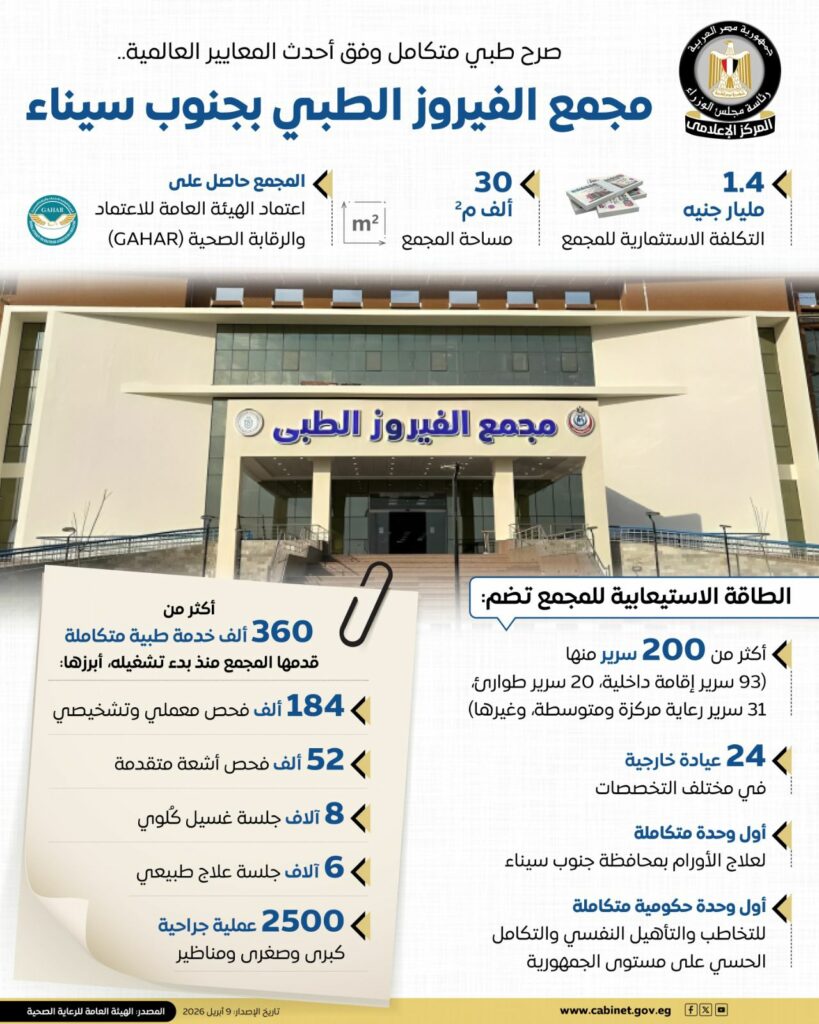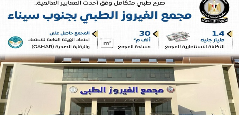 أكد المركز الإعلامي لمجلس الوزراء، اليوم الخميس، أن مجمع الفيروز الطبي بجنوب سيناء، يعد نموذجًا متكاملًا للرعاية الصحية الحديثة وفق أحدث المعايير العالمية، إذ بلغت تكلفة إنشائه وتجهيزه 1.4 مليار جنيه، بما يضمن تقديم خدمات طبية متقدمة تضاهي كبرى المنشآت الصحية إقليميًا ودوليًا وتليق بالمواطن المصري.