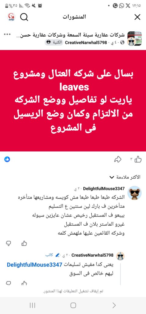 وأثارت التعليقات المتداولة حالة من القلق، بعدما تضمنت آراء من مستخدمين تحدثوا عن تأخيرات في بعض المشروعات، ومشكلات تتعلق بمدد التسليم، إلى جانب مزاعم بشأن اللجوء إلى البيع بأسعار منخفضة لتوفير السيولة، وفقًا لما ورد في المناقشات المنشورة، دون صدور رد رسمي موضح حتى الآن.
