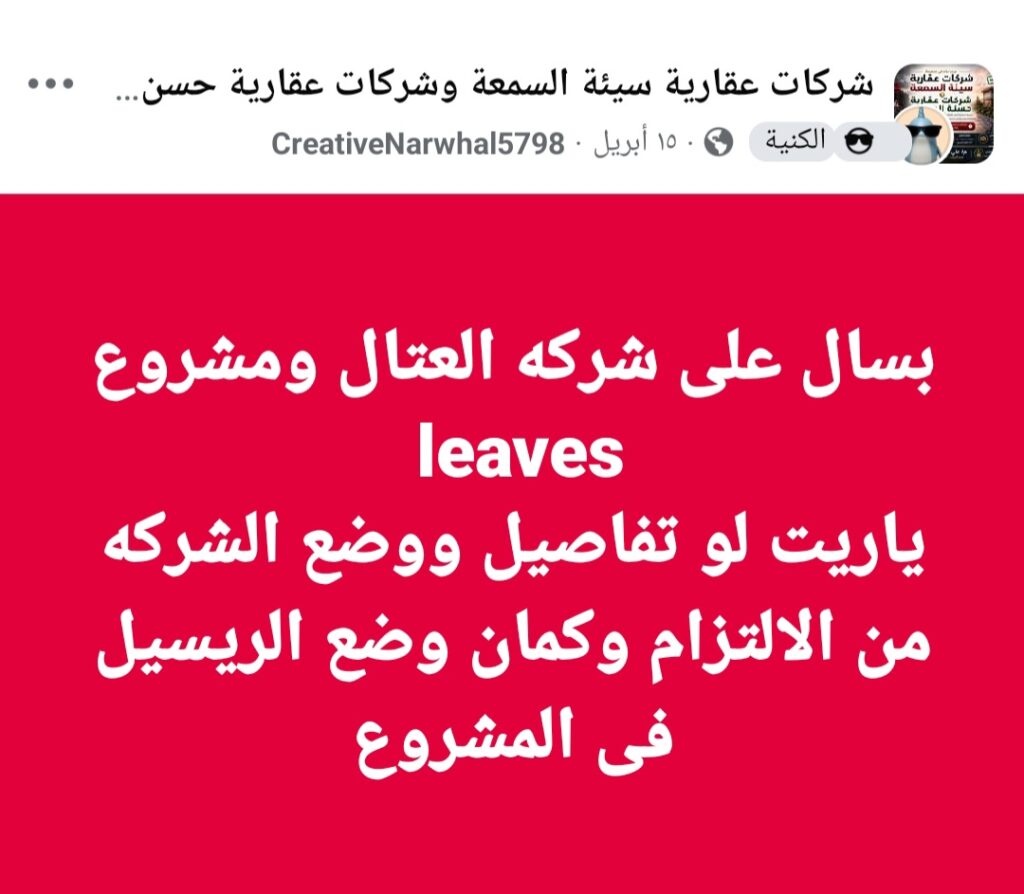 شهدت إحدى المجموعات المتخصصة في مناقشة أخبار السوق العقاري تداول منشور يتضمن استفسارًا من أحد المتابعين بشأن شركة العتال ومشروع Leaves، طالب خلاله بمعرفة تفاصيل عن وضع الشركة ومدى الالتزام، إلى جانب الاستفسار عن أوضاع إعادة البيع داخل المشروع.