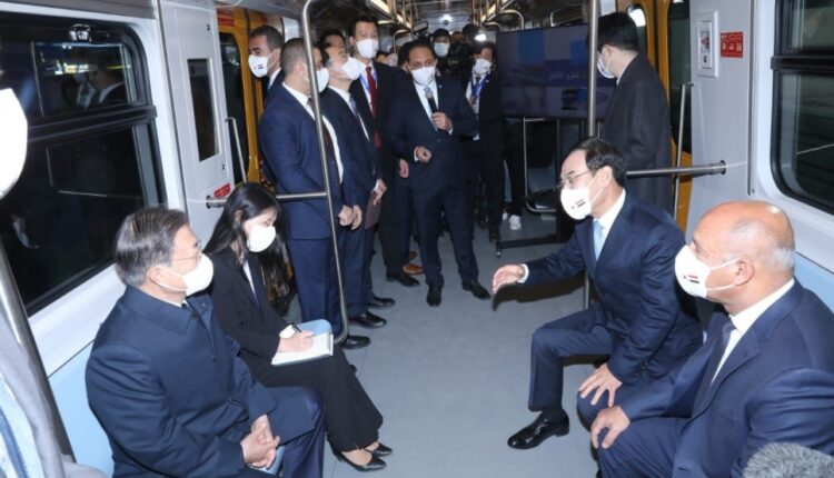 استمع الرئيس الكوري الجنوبي، خلال استقلال القطار، لشرح مختصر عن مشروع الخط الثالث لمترو الأنفاق الذي يربط بين شرق وغرب القاهرة الكبرى ويمتد بطول 41.2 كم وعدد 34 محطة وقد تم تشغيل 3 مراحل منه بطول 23.5 كيلو متر، و19 محطة وجاري حالياً تنفيذ تالمرحلة الأخيرة منه بطول 17.7 كيلو متر و15 محطة، بالإضافة إلى استعراض مدى مساهمة الحكومة الكورية في تنفيذ مشروعات المترو والتي من تشمل العقد الموقع مع شركة هيونداي روتيم الكورية لتصنيع وتــوريد 32 قطار مكيـــف للخط الثالث بالاضافة إلي 8 سنوات صيانة وعمرة جسيمة وحيث تبلغ قيمة العقد 640 مليون جنيه بالإضافة إلى 317.7 مليون يورو ويتم تمويل الشق الأجنبى للعقد من خلال الحكـــومة الكورية ، وكذا تم استعراض مميزات القطارات الكورية من الداخل والخارج ومخطط توريدها حيث تم توريد 18 قطار ومكونات 5 قطارات من القطارات التى سيتم تجميعها في سيماف لنقل الخبرات للفنيين والعمال المصريين ودخول 10 قطارات الخدمة وجارى عمل الإختبارات الديناميكية لباقى القطارات الموردة بالورش ليتم دخولهم الخدمة تباعاً.